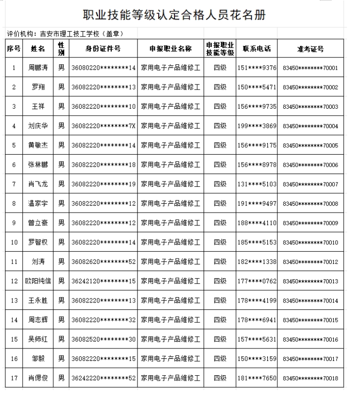 按照《贛人社規(guī)【2022】7號(hào)》文件精神。我校于2025年3月27日開展了家用電子產(chǎn)品維修工等級(jí)認(rèn)定,共18人(四級(jí)),通過認(rèn)定考核17人?,F(xiàn)對(duì)認(rèn)定考核合格人員進(jìn)行公示。(名單附后)