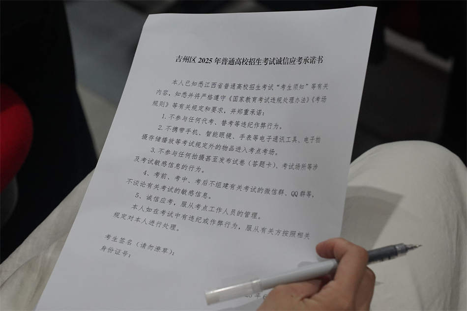 此外,學(xué)校還組織全體考生簽署了《吉州區(qū)2025年普通高校招生考試誠信應(yīng)考承諾書》。大家在承諾書上鄭重簽名,承諾將嚴(yán)格遵守考試紀(jì)律,誠信應(yīng)考,以實(shí)際行動(dòng)維護(hù)高考的公平公正。