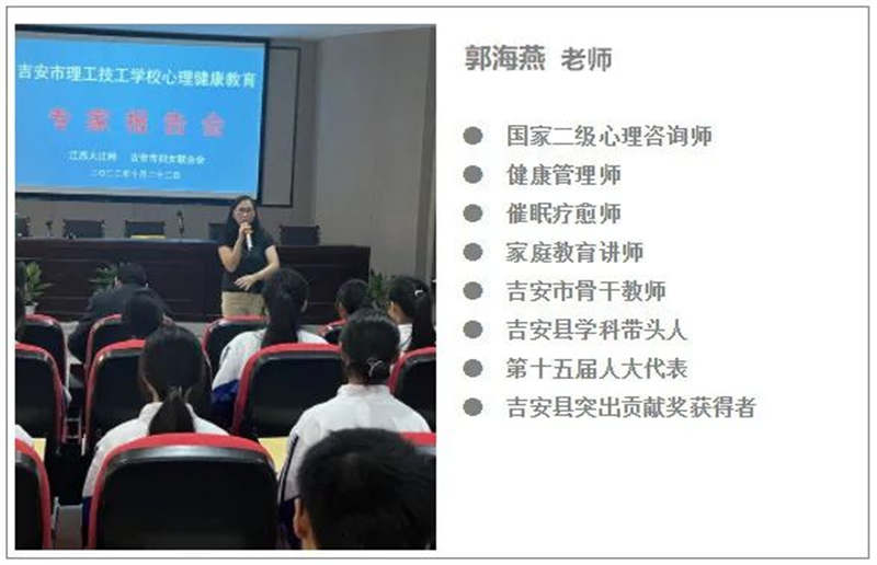 2022年10月22日,在我校多功能廳舉辦了吉安市理工技工學(xué)校心理健康教育專家報(bào)告會(huì)。會(huì)議由大江網(wǎng)和吉安市婦聯(lián)承辦,為表示對(duì)我校心理健康教育的關(guān)心,特邀郭海燕老師來(lái)我校作報(bào)告。