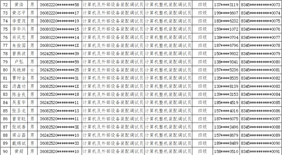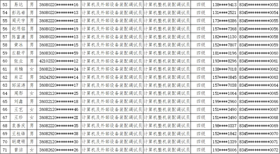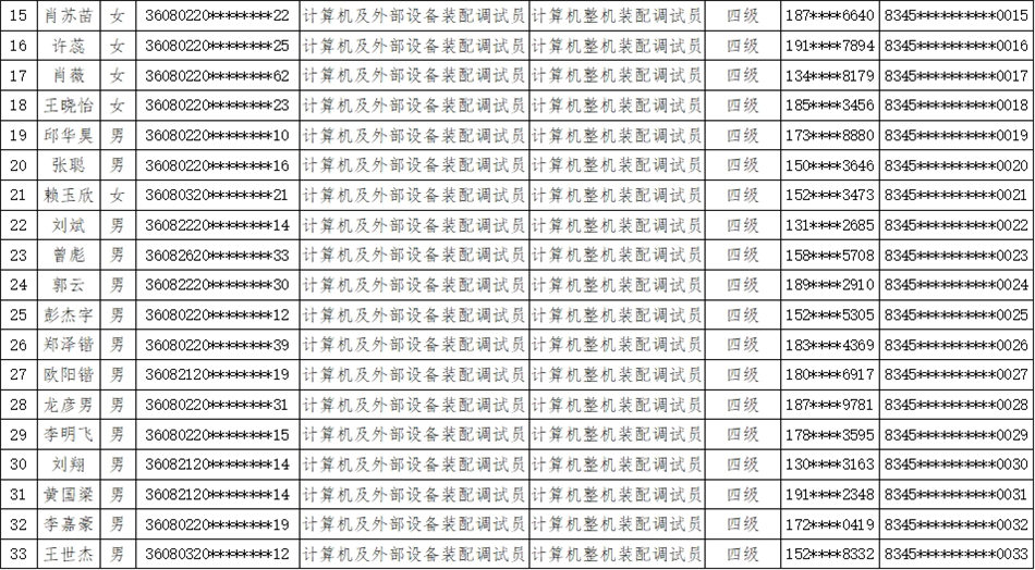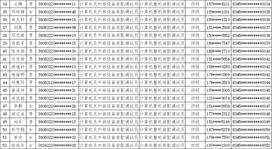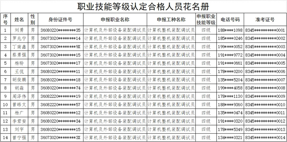 根據(jù)職業(yè)技能等級(jí)認(rèn)定組織實(shí)施規(guī)定,按照國(guó)家職業(yè)技能標(biāo)準(zhǔn),我校于2023年12月28日開展了計(jì)算機(jī)及外部設(shè)備裝配調(diào)試員等級(jí)認(rèn)定,經(jīng)理論知識(shí)考試和專業(yè)技能考核,現(xiàn)將認(rèn)定考核成績(jī)合格人員名單進(jìn)行公示,詳見附件。