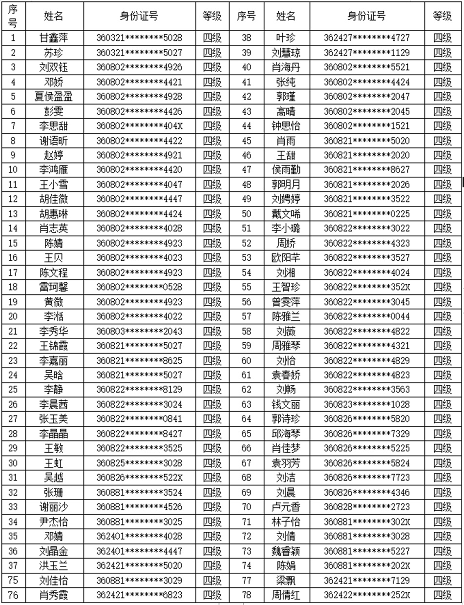 根據(jù)《江西省人力資源和社會(huì)保障廳關(guān)于遴選備案職業(yè)技能等級(jí)認(rèn)定社會(huì)培訓(xùn)評(píng)價(jià)組織的通知》(贛人社字(2020)302號(hào))、《江西省人力資源和社會(huì)保障廳關(guān)于公布江西省第二批職業(yè)技能等級(jí)認(rèn)定社會(huì)培訓(xùn)評(píng)價(jià)組織的通知》(贛人社字(2022)128號(hào))文件要求。按照《關(guān)于開展“互聯(lián)網(wǎng)+職業(yè)技能等級(jí)認(rèn)定”試點(diǎn)工作的通知》(贛人社字〔2020〕397號(hào))精神。我校于2024年4月11日開展了保育師等級(jí)認(rèn)定,共82人(四級(jí)),通過認(rèn)定考核78人?,F(xiàn)對(duì)認(rèn)定考核合格人員進(jìn)行公示(名單附后)。
