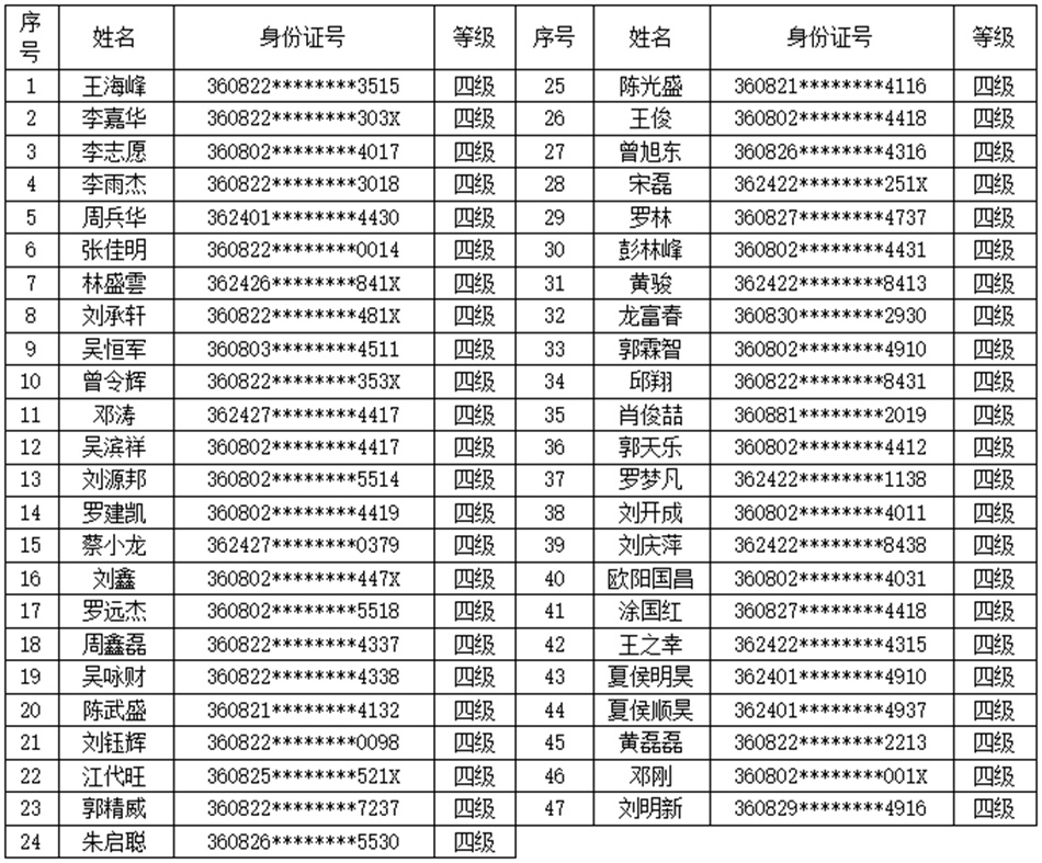 根據(jù)《江西省人力資源和社會(huì)保障廳關(guān)于遴選備案職業(yè)技能等級(jí)認(rèn)定社會(huì)培訓(xùn)評(píng)價(jià)組織的通知》(贛人社字(2020)302號(hào))、《江西省人力資源和社會(huì)保障廳關(guān)于公布江西省第二批職業(yè)技能等級(jí)認(rèn)定社會(huì)培訓(xùn)評(píng)價(jià)組織的通知》(贛人社字(2022)128號(hào))文件要求。按照《關(guān)于開展“互聯(lián)網(wǎng)+職業(yè)技能等級(jí)認(rèn)定”試點(diǎn)工作的通知》(贛人社字〔2020〕397號(hào))精神。我校于2024年4月15日開展了汽車維修工(汽車維修檢驗(yàn)工)等級(jí)認(rèn)定,共48人(四級(jí)),通過(guò)認(rèn)定考核47人。現(xiàn)對(duì)認(rèn)定考核合格人員進(jìn)行公示(名單附后)。
