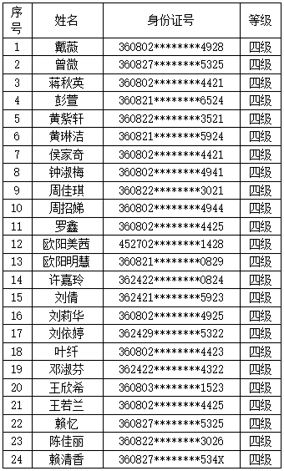 根據(jù)《江西省人力資源和社會(huì)保障廳關(guān)于遴選備案職業(yè)技能等級(jí)認(rèn)定社會(huì)培訓(xùn)評(píng)價(jià)組織的通知》(贛人社字(2020)302號(hào))、《江西省人力資源和社會(huì)保障廳關(guān)于公布江西省第二批職業(yè)技能等級(jí)認(rèn)定社會(huì)培訓(xùn)評(píng)價(jià)組織的通知》(贛人社字(2022)128號(hào))文件要求。按照《關(guān)于開展“互聯(lián)網(wǎng)+職業(yè)技能等級(jí)認(rèn)定”試點(diǎn)工作的通知》(贛人社字〔2020〕397號(hào))精神。我校于2024年4月17日開展了美容師等級(jí)認(rèn)定,共25人(四級(jí)),通過認(rèn)定考核24人。現(xiàn)對(duì)認(rèn)定考核合格人員進(jìn)行公示(名單附后)。