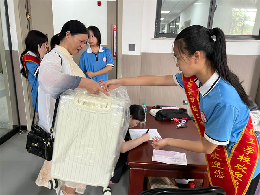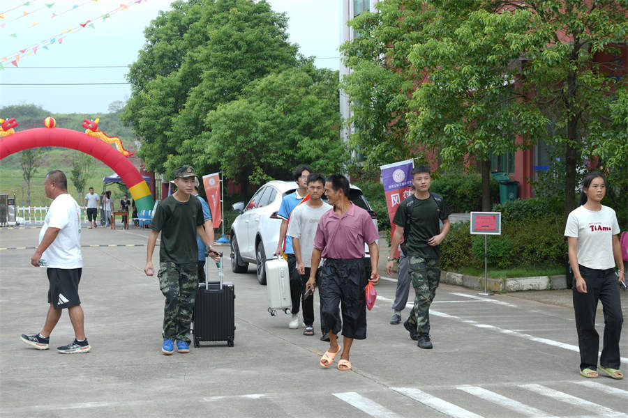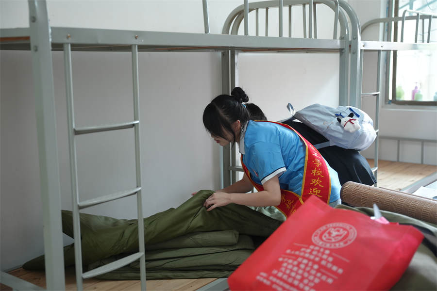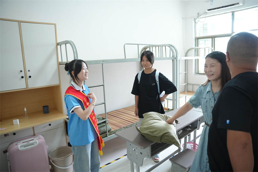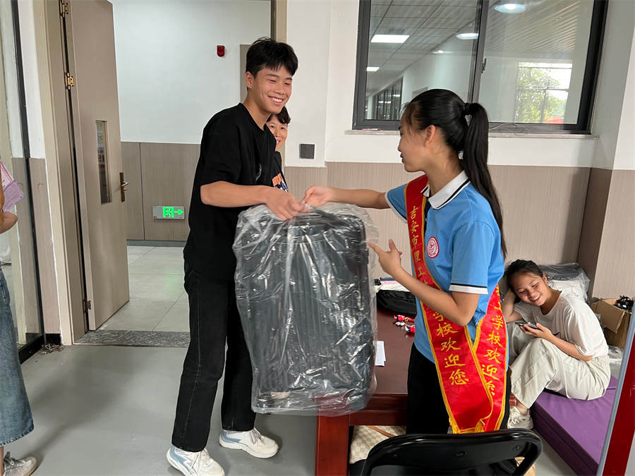 校園里,學(xué)生、老師、志愿者忙碌在各個環(huán)節(jié),協(xié)助新同學(xué)搬運行李、辦理手續(xù)等,幫助新生迅速熟悉學(xué)校,志愿者熱情帶領(lǐng)學(xué)生從進(jìn)校門到安排好寢室,并幫忙整理床鋪打掃衛(wèi)生,服務(wù)體貼入微。