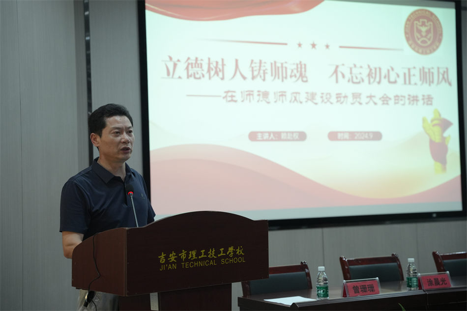 時(shí)維九月,序?qū)偃?。為了進(jìn)一步提高廣大教師的職業(yè)道德水平,為學(xué)生的健康成長提供更好的教育環(huán)境,加快推動學(xué)校教育事業(yè)健康發(fā)展,努力辦好人民滿意的教育,2024年9月4日,吉安市理工技工學(xué)校隆重地舉行了一場師德師風(fēng)“靈魂工程”建設(shè)動員大會。會議由執(zhí)行校長汪榮華主持。