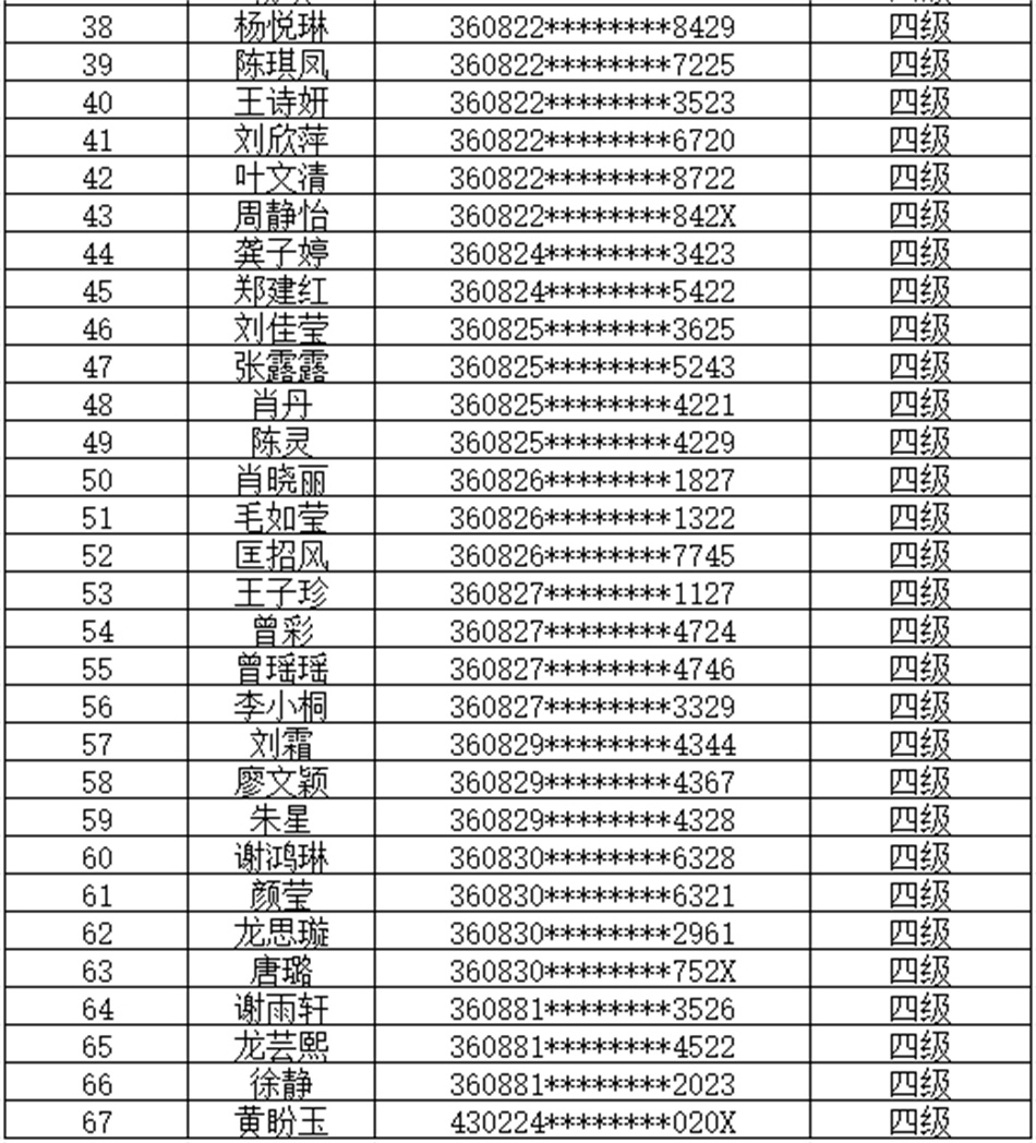 根據(jù)《江西省人力資源和社會(huì)保障廳關(guān)于遴選備案職業(yè)技能等級(jí)認(rèn)定社會(huì)培訓(xùn)評(píng)價(jià)組織的通知》(贛人社字(2020)302號(hào))、《江西省人力資源和社會(huì)保障廳關(guān)于公布江西省第二批職業(yè)技能等級(jí)認(rèn)定社會(huì)培訓(xùn)評(píng)價(jià)組織的通知》(贛人社字(2022)128號(hào))文件要求。按照《關(guān)于開展“互聯(lián)網(wǎng)+職業(yè)技能等級(jí)認(rèn)定”試點(diǎn)工作的通知》(贛人社字(2020)397號(hào))精神。我校于2024年10月31日開展了養(yǎng)老護(hù)理員等級(jí)認(rèn)定,共70人(四級(jí)),通過(guò)認(rèn)定考核67人?,F(xiàn)對(duì)認(rèn)定考核合格人員進(jìn)行公示(名單附后)。
