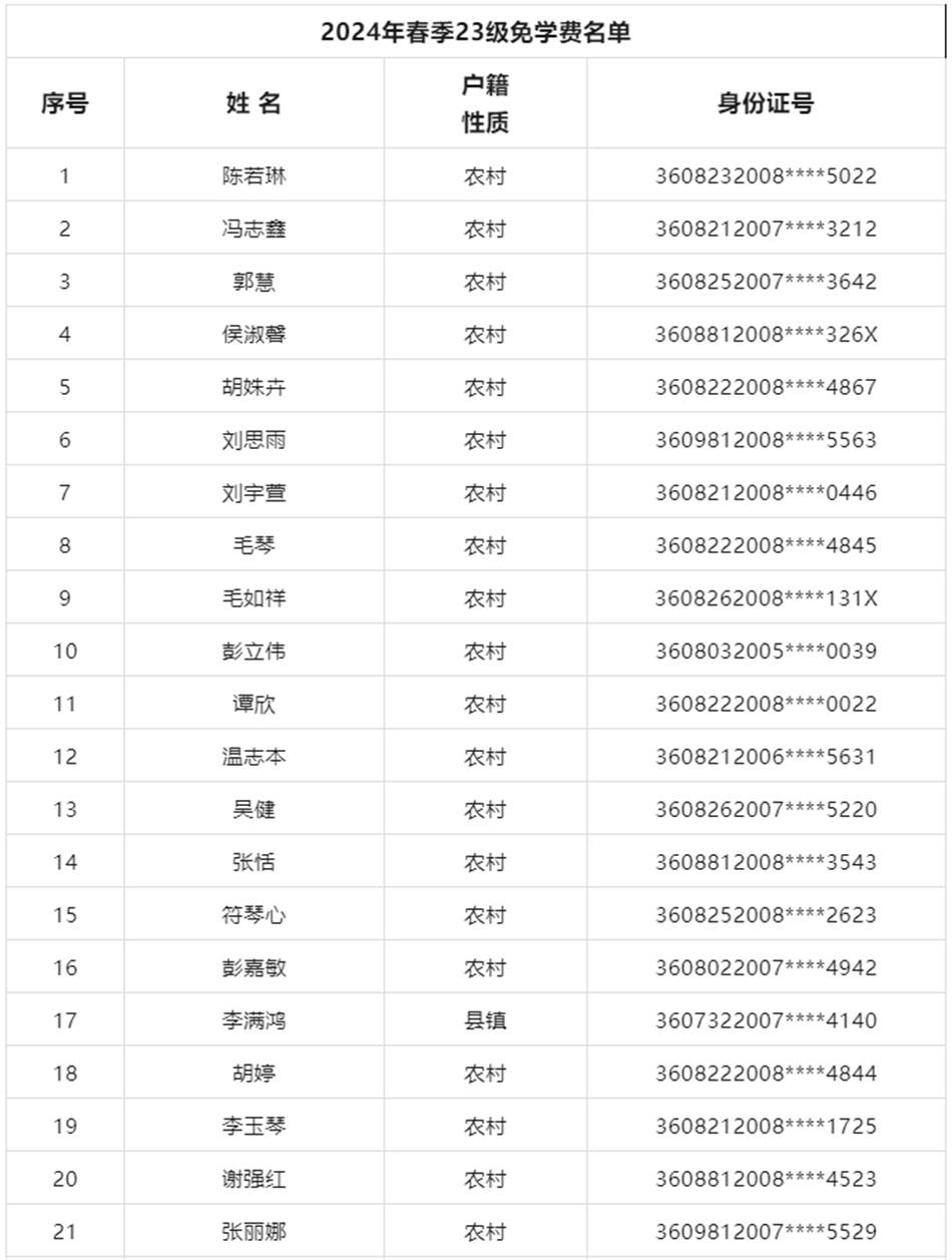 2024年春季學(xué)期我校21級學(xué)生免學(xué)費(fèi)申報(bào)526人,22級免學(xué)費(fèi)申報(bào)394人,23級免學(xué)費(fèi)293人,22級助學(xué)金143人,23級助學(xué)金90人,具體申報(bào)名單見以下,公示日期為4月2日至4月12日。如有疑問請于公示日期內(nèi)向校紀(jì)檢監(jiān)察室或省人力資源和社會保障廳職業(yè)能力建設(shè)處反映。