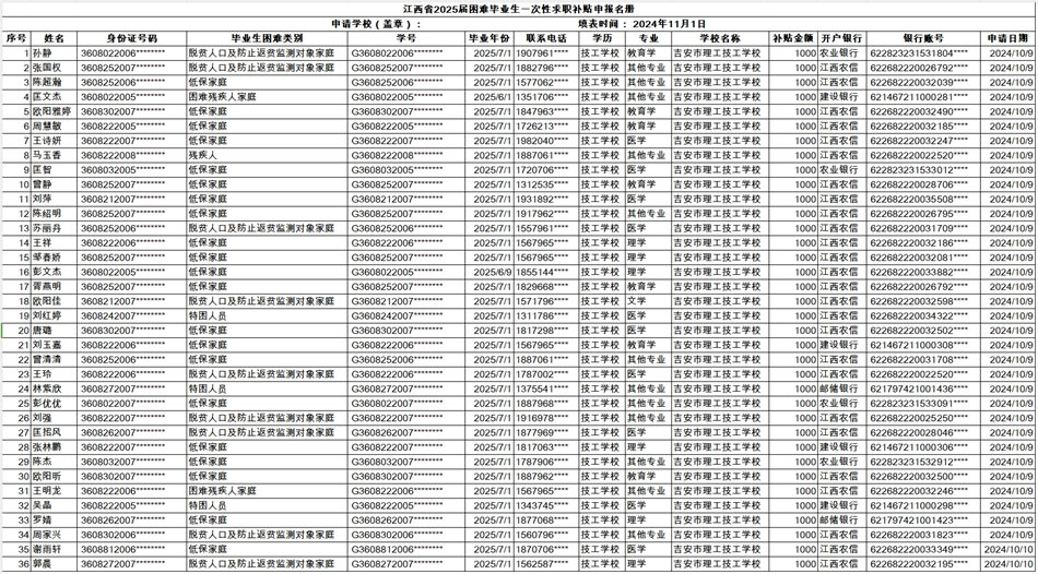 吉安市理工技工學(xué)校2025屆畢業(yè)生申請(qǐng)一次性求職創(chuàng)業(yè)補(bǔ)貼人員名單已公布,如有疑問請(qǐng)于公示日期內(nèi)向我校相關(guān)部門反映。